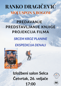 Autor će predstaviti svoju knjigu „Moj uspon s Bogom“, u kojoj donosi osobno i iskreno svjedočanstvo o usponu na Denali, najviši vrh Sjeverne Amerike. Publika će imati priliku čuti kako su izgledale višemjesečne pripreme, s kakvim se izazovima susretao na samoj planini te što znači suočiti se sa sobom u ekstremnim uvjetima.