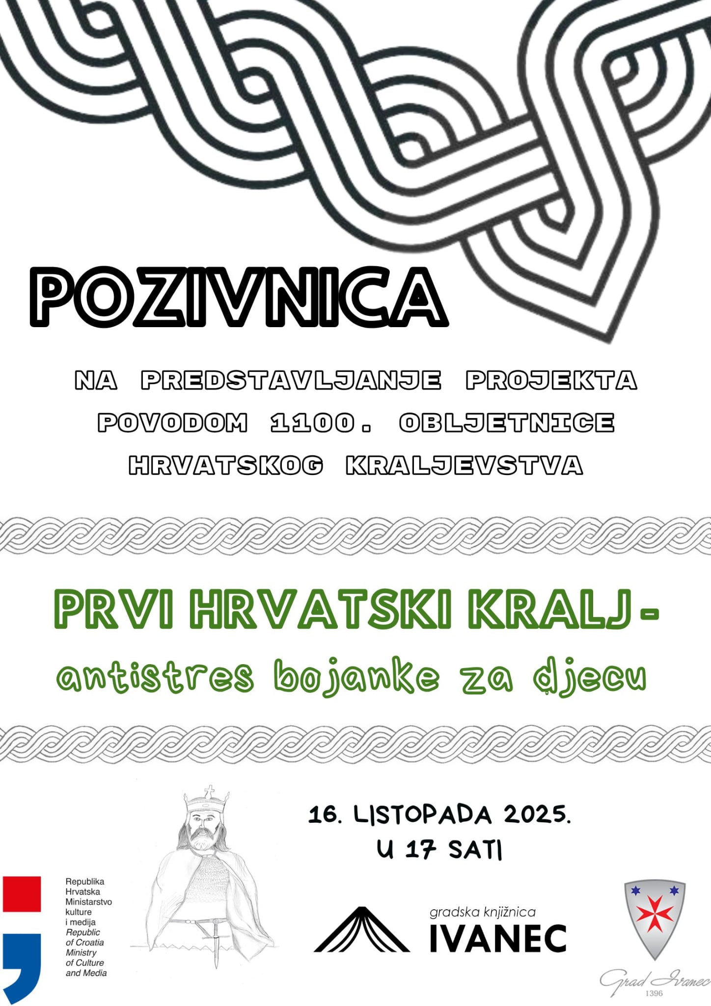 Dana 16. listopada 2025. u Gradskoj knjižnici Ivanec održano je predstavljanje edukativno-kreativnog projekta „Prvi hrvatski kralj – izrada antistres bojanke za djecu“. Projekt je osmišljen s ciljem približavanja hrvatske povijesti najmlađima kroz umjetnost, ilustraciju i stvaralački rad, s posebnim naglaskom na lik i vrijeme kralja Tomislava.