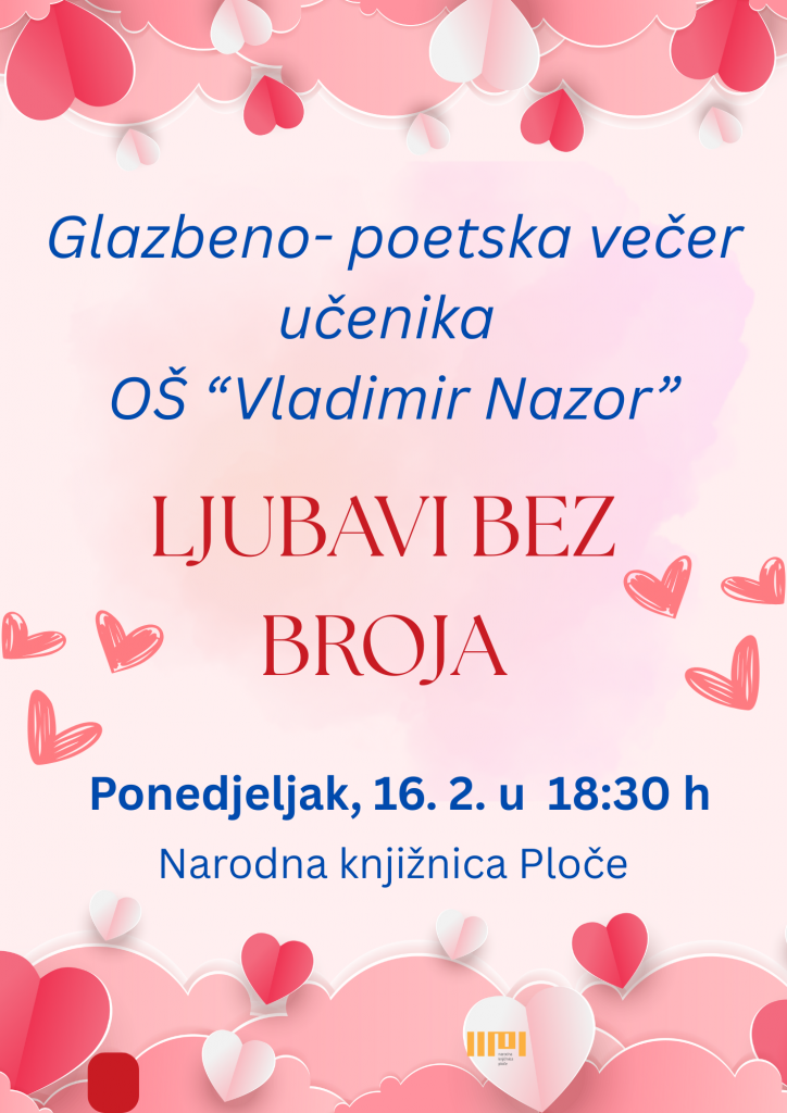 Pozivamo vas na (tradicionalnu) glazbeno-poetsku večer učenika Osnovne škole “Vladimir Nazor” Ploče povodom Valentinova u Narodnoj knjižnici Ploče.