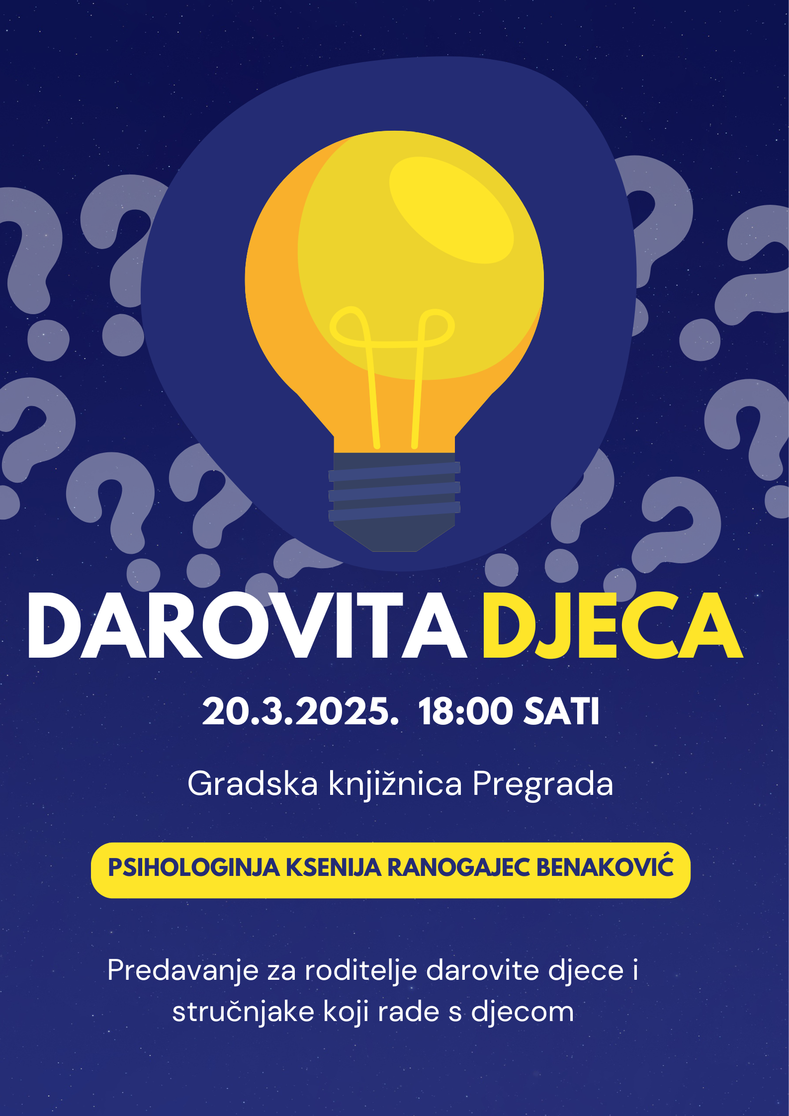 Povodom Međunarodnog dana darovitih učenika pozivamo sve roditelje darovite djece, stručnjake koji rade s djecom i sve koje zanima ta tema na predavanje Darovita djeca, koje će se održati: