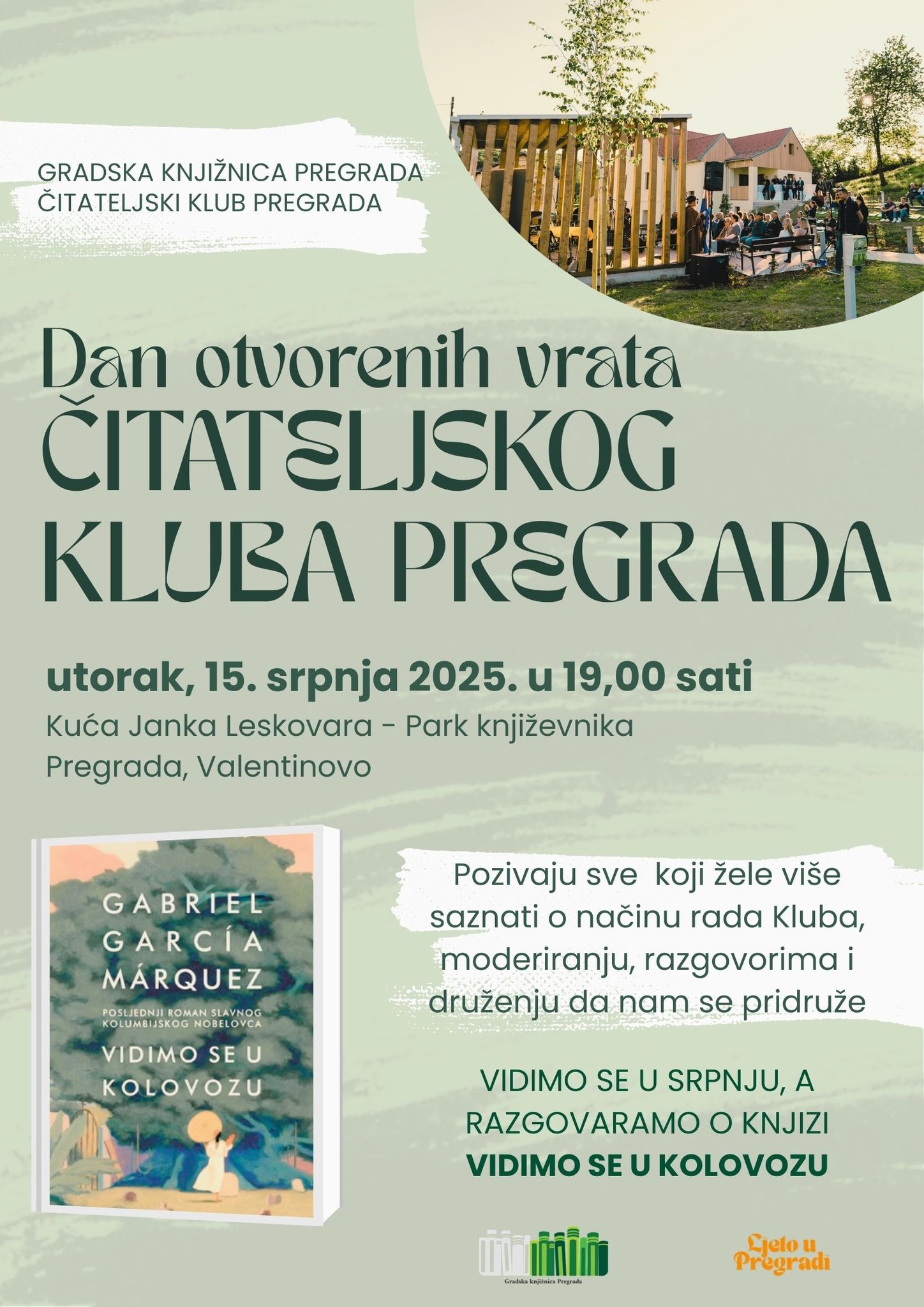 Dan otvorenih vrata Čitateljskog kluba Pregrada 15. srpnja 2025. By GKP Svi ste nam dobrodošli – pročitana knjiga nije uvjet! Nadamo se da će netko od vas biti naš budući član! PROMJENA MJESTA ODRŽAVANJA Zbog najave loših vremenskih prilika, Dan otvorenih vrata Čitateljskog kluba održat će se u Knjižnici u 19,00 sati! U Parku književnika vidimo se nekom drugom prigodom