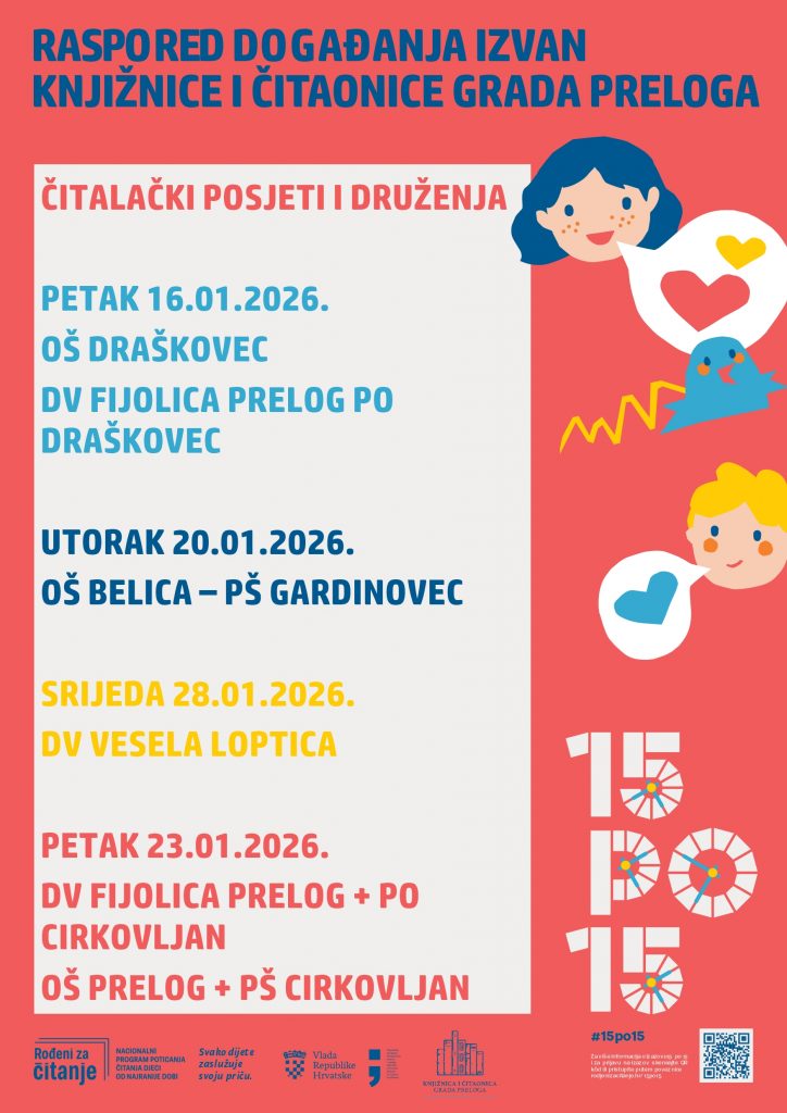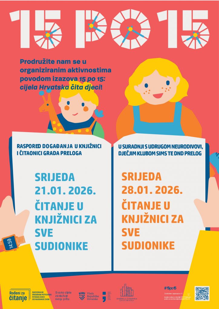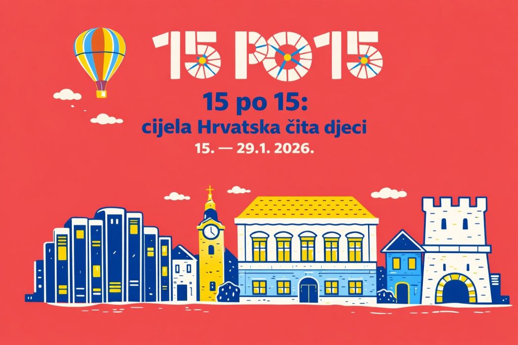 Nacionalni čitalački izazov „15 po 15: cijela Hrvatska čita djeci“ poziva roditelje, skrbnike, odgojitelje, učitelje, knjižničare i sve odrasle koji brinu o djeci da 15 dana zaredom, svakodnevno, djeci čitaju najmanje 15 minuta. Izazov započinje 15. siječnja 2026. godine, a njegov je cilj potaknuti razvoj trajne navike zajedničkog čitanja u obiteljima i odgojno-obrazovnim ustanovama diljem Hrvatske.